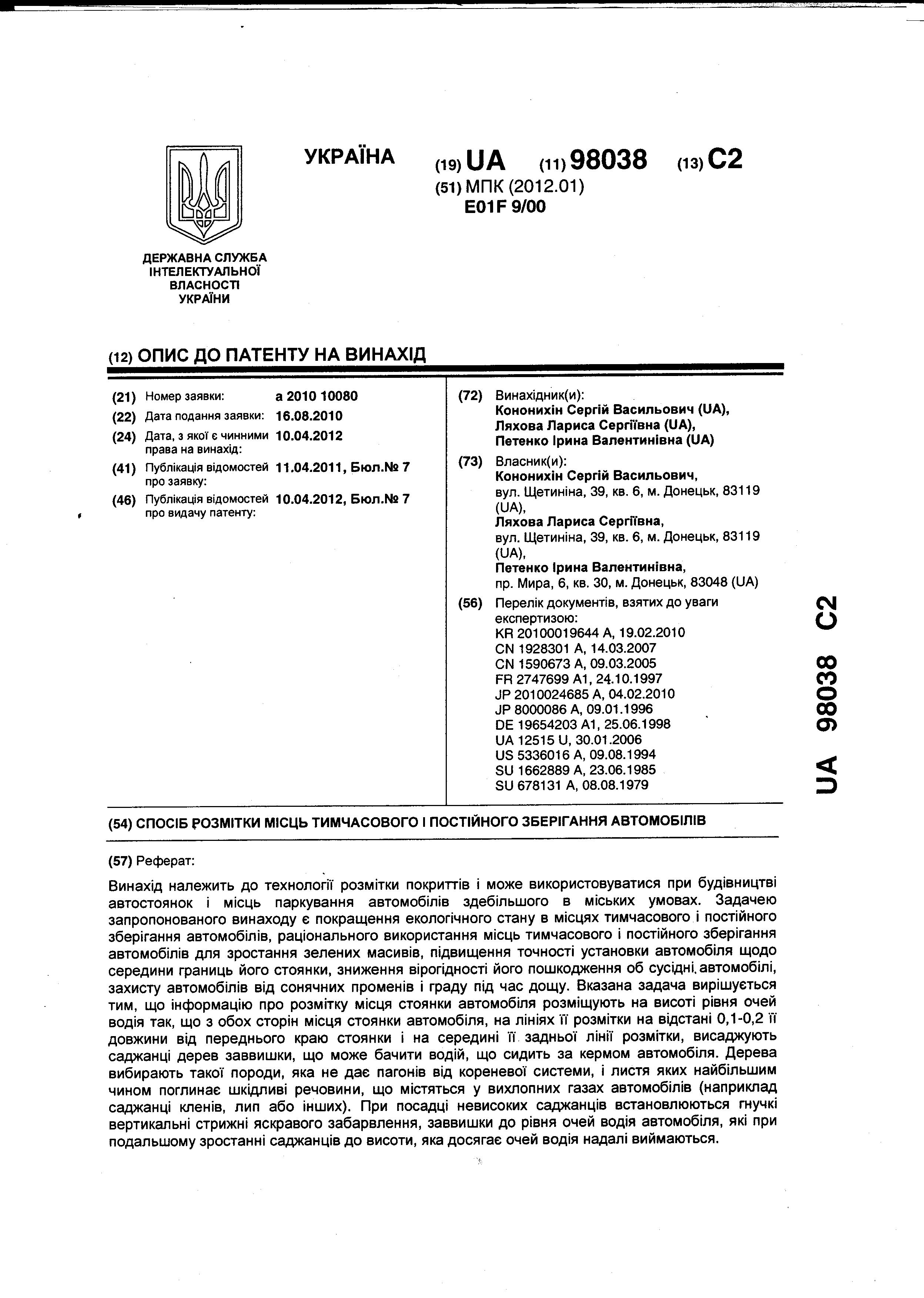 Описание: Пат. 98038 Україна, Спосіб розмітки місць тимчасового і постійного зберігання автомобілів; Заявл. 16.08.2010; Опубл. 11.04.2011, Бюл.№7.