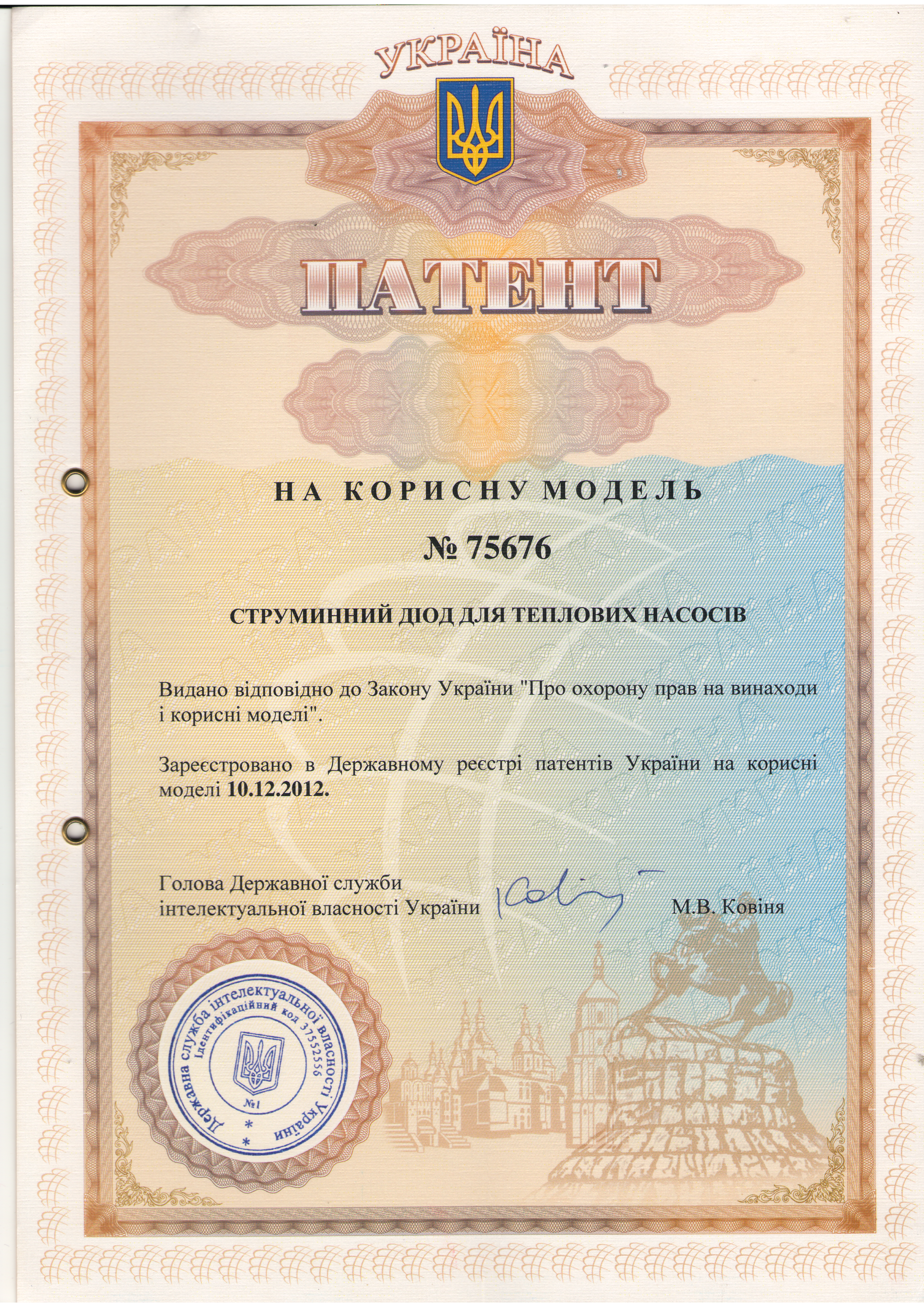 Библиографическое описание: Струминний діод для теплових насосів : пат. на корисну модель / М.Г. Бойко, В.М. Оверко, М.В. Оверко, М.О. Палій ; Донец. держ. техн. ун-т .- № 75676 ; зареєстровано 10.12.2012.; бюл.№23.