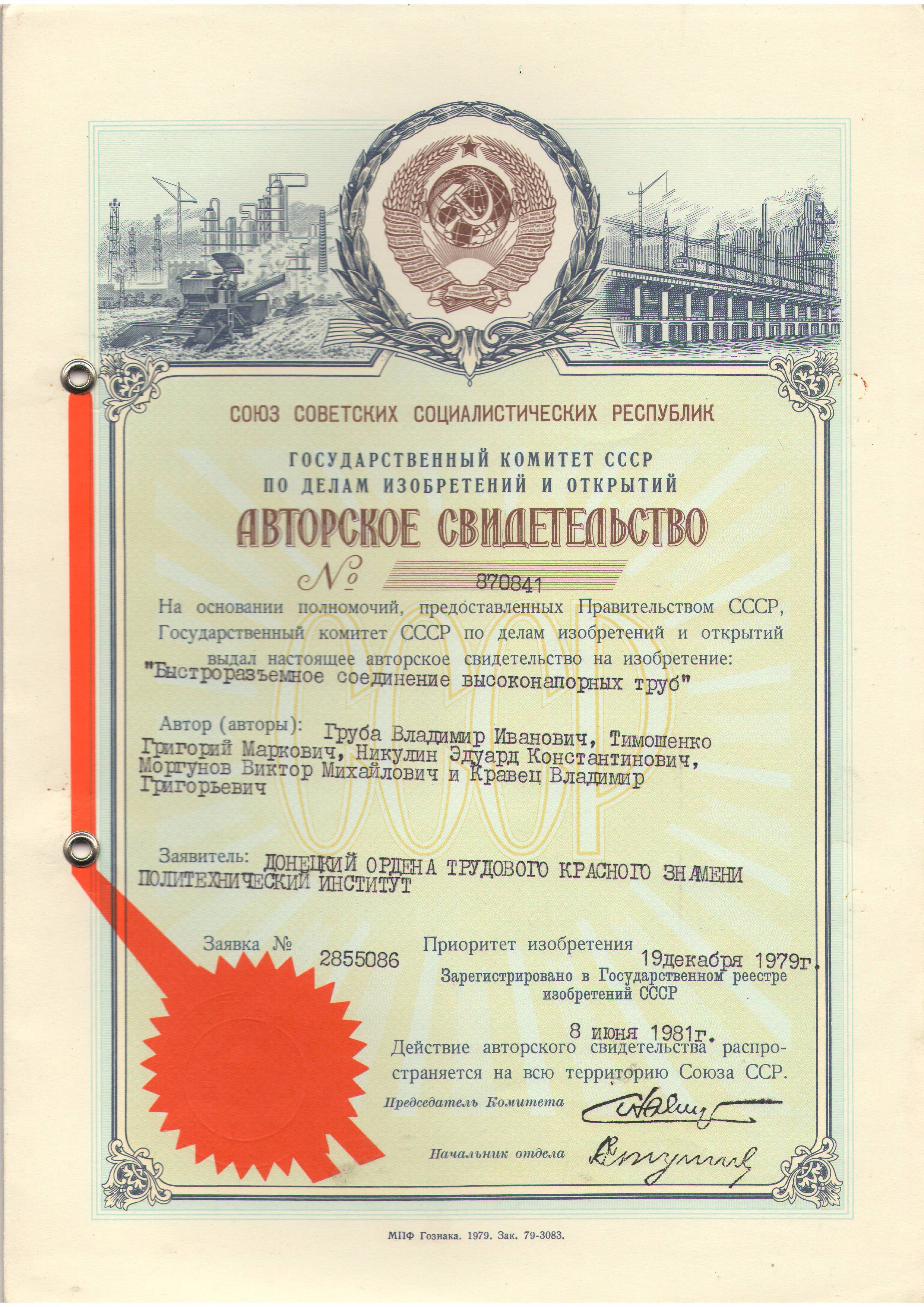 Библиографическое описание: А.с. 870841. Быстроразъемное соединение высоконапорных труб / В.И. Груба, Г.М. Тимошенко , Э.К. Никулин, В.М. Моргунов, В.Г.Кравец ; Донец. политен. ин-т(СССР) .- № 2850586; заявл. 19.12.79; опубл. 08.06.1981, Бюл. № 37.